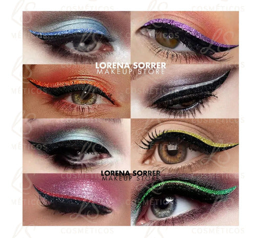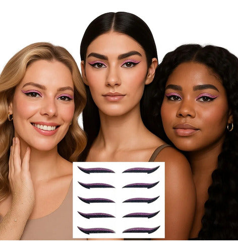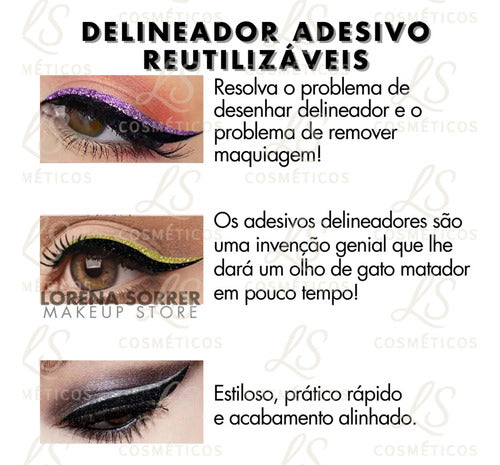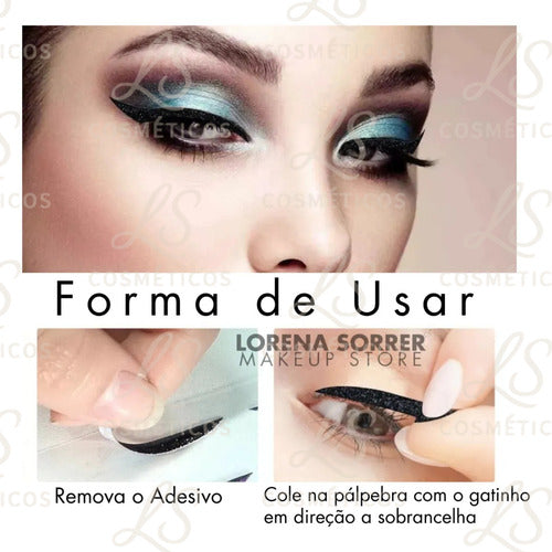 Cada cartela vem com pares de delineadores em diferentes cores vibrantes e sofisticadas com acabamento em glitter realista que transforma qualquer look básico em algo impactante. A aplicação é simples: basta destacar, colar e pronto. Ele se adapta ao formato dos olhos, garante excelente fixação e não escorre, mesmo em dias quentes ou durante festas longas.